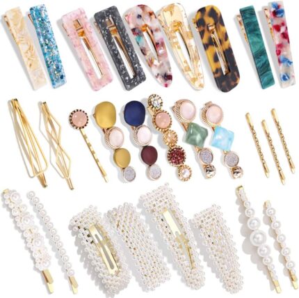 28 PCS Hingwah Pearls and Acrylic Resin Hair Clips, Handmade Hair Barrettes, Marble Alligator bobby pins, Glitter Crystal Geometric Hairpin, Elegant Gold Hair Accessories, Gifts for Women Girls