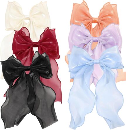 6pcs Oversized Hair Bows and Ribbons for Women, Silky Satin Long Tail Bowknot Barrettes With Metal Clips Ponytail Hair Accessories for Adult Teens