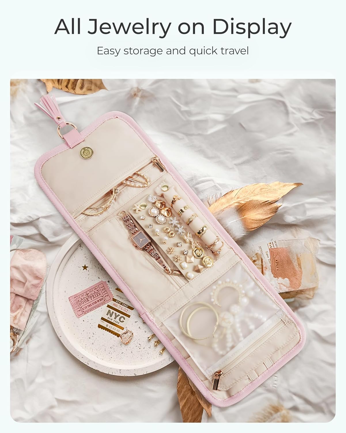 BAGSMART Travel Jewelry Case Organizer, Roll Foldable Jewelry Case for Journey-Rings, Necklaces, Earrings, Bracelets, Brooches, Min, Pink