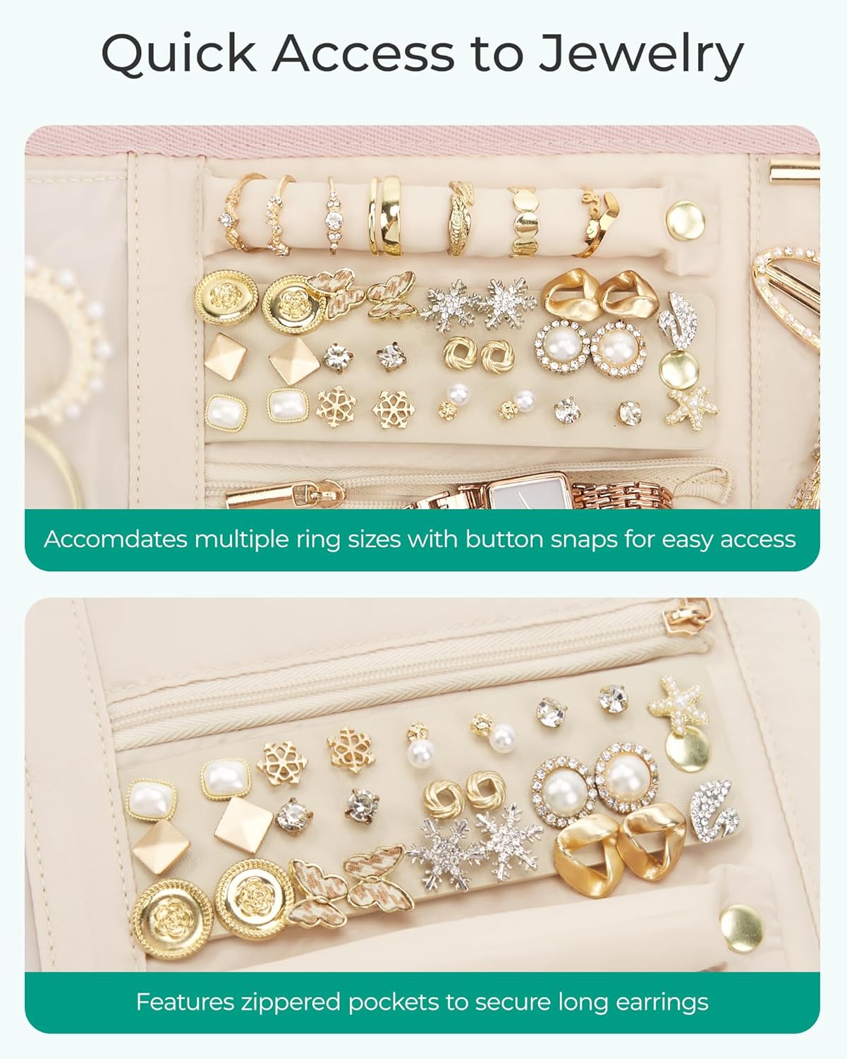 5 Functional Zones: It easily holds watches, pearl necklaces, earrings, thin and thick necklaces, rings, bracelets, hair clips, and more. The smart layout makes it simple to store all your everyday pieces.