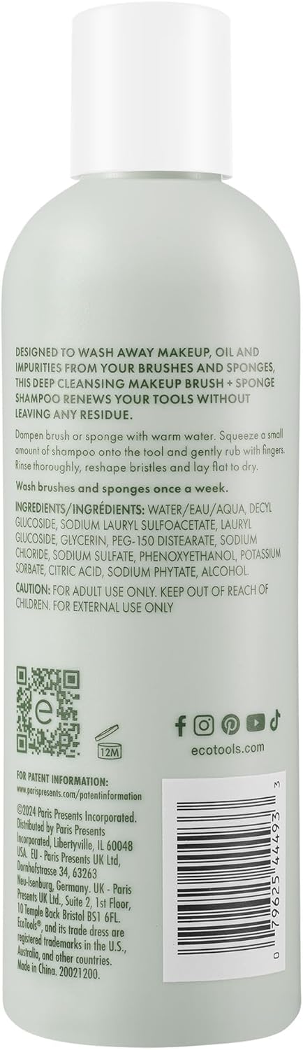 EcoTools Makeup Brush + Sponge Shampoo, Remove Makeup & Impurities From Tools, Sponges, & Puffs, Fragrance-Free Brush Cleanser, No Harsh Chemicals, Vegan, & Cruelty-Free, 8 fl. oz./236 ml. Bottle