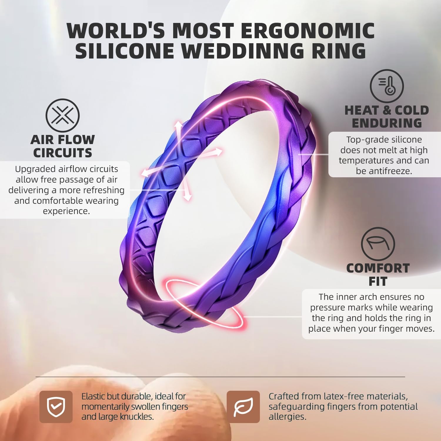 Our Egnaro silicone rings are pretty,smooth,comfy and flexible enough to be wore in all occasions without gotten off. No matter you’re doing heavy work or at the gym, climbing and other outdoor sports.