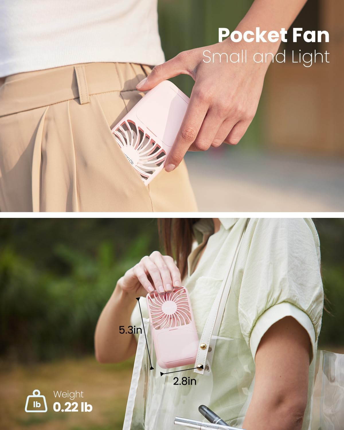 Ultra-portable and Lightweight: Compact design makes the handheld fan a great airplane travel essentials; The mini fan only weighs 0.21 lb, easily keep in pocket, purse, cosmetics bag when travelling or on the road; The wrist strap will waive your hands