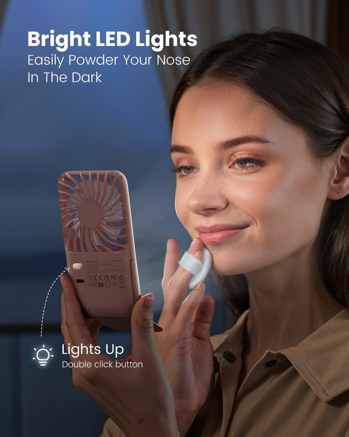 Gaiatop Portable Handheld Fan, Folding Stand for Desktop, 3 Speed LED Makeup Mirror with Light, Rechargeable Mini Personal Fans Small Travel Essentials Gifts for Women Girls Pink