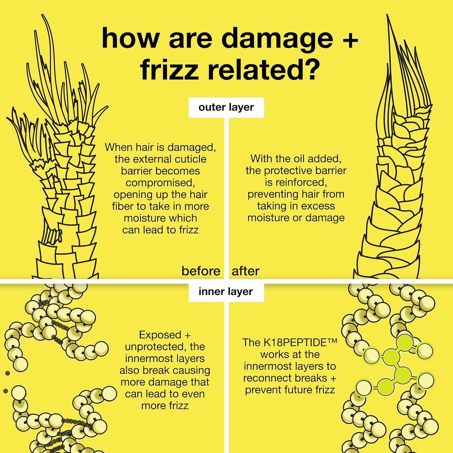 This lightweight, biotechnology-designed oil works on all hair types to strengthen, repair damage, reduce frizz in two levels of the hair fiber and improve shine. Strengthening and softening hair oil acts on two levels of the hair fiber to fight frizz. K18PEPTIDE acts to address the deeper level damage frizz causes, repairing and strengthening damage to the innermost layer of hair to reverse the damage that leads to frizz. In