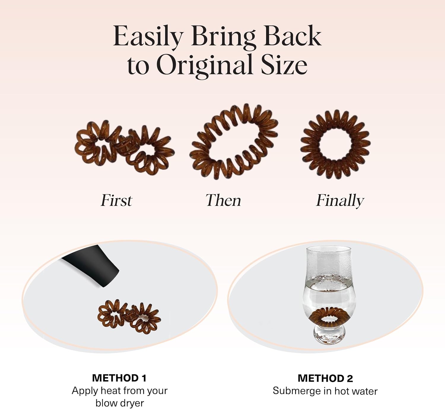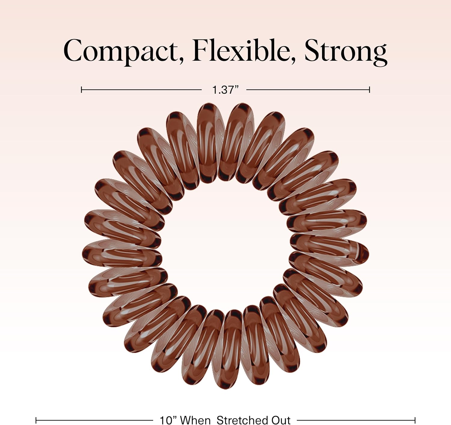 Although Kitsch Hair Coils are only 1.5 inches in diameter, don’t be deceived by their small size! These coils stretch easily and generously to hold up all of your hair in a ponytail, messy bun or braid with ease, and comfortably stretch to be worn as a bracelet on your wrist when not in use so they are ready for ponytail or messy bun duty at any time. If your coil happens to stretch larger than its original size, simply place it in a cup of warm water or use a hot blow dryer to shrink it to its original size.