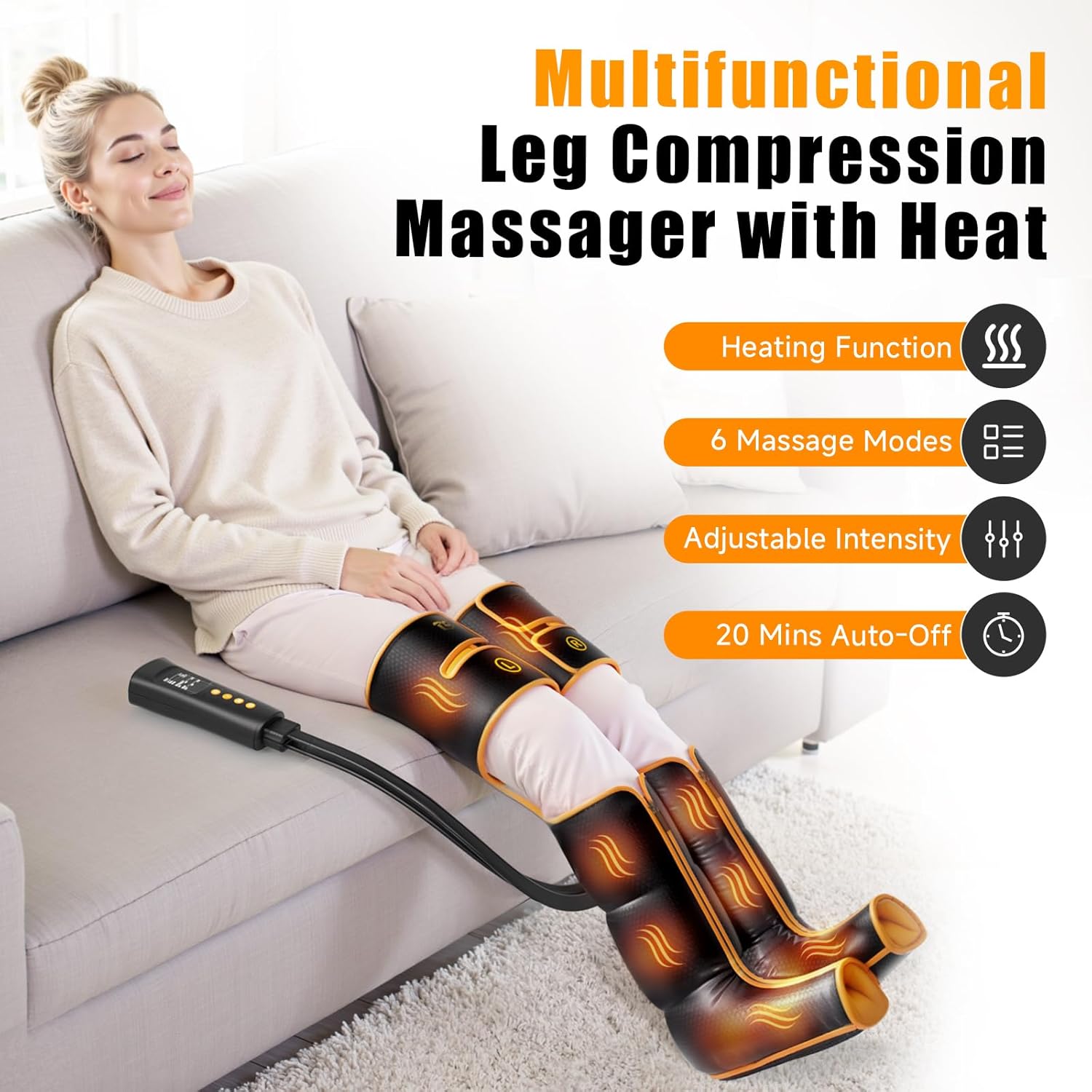 Convenient LED Controller: Easily operate this leg compression massager for circulation using a handheld LED backlit controller. It offers 6 professional massage modes, 6 intensity levels, and 3 heat settings. A built-in 20-minute shut-off function prevents overheating and excessive pressure, ensuring safe use. Instantly relieve leg pain, allowing your feet and legs to enjoy deep relaxation without leaving your comfortable sofa or desk.