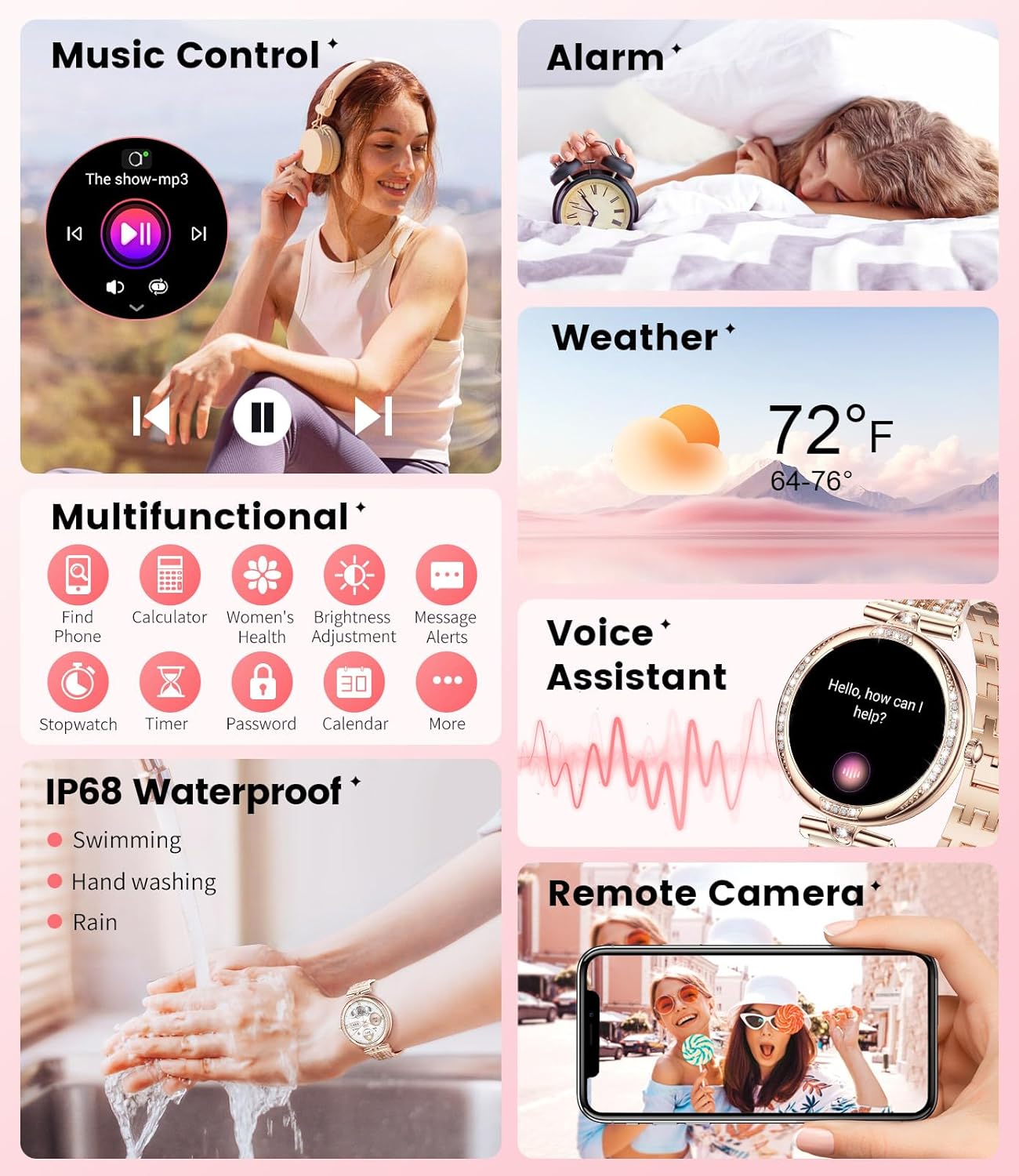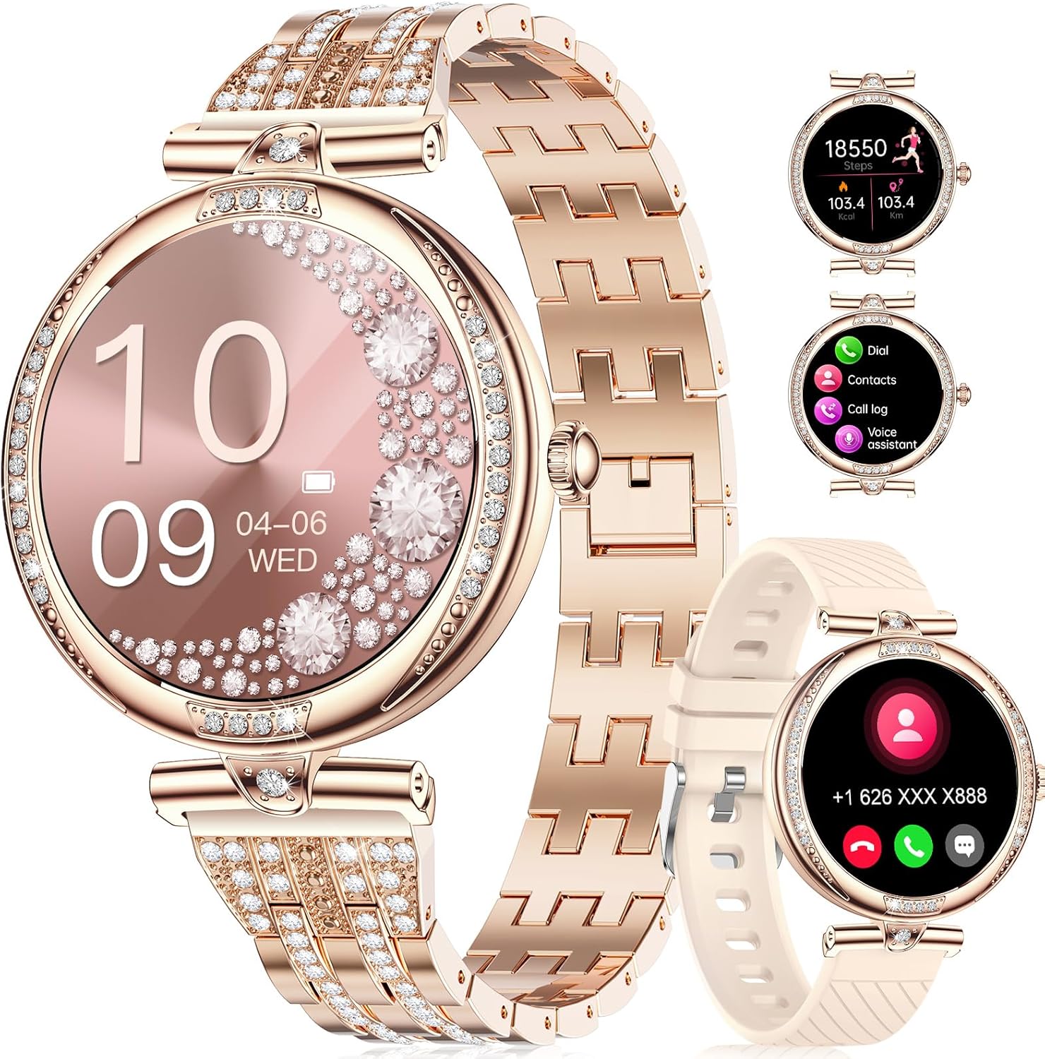 【Two Straps, Two Styles】This IP68 waterproof smartwatch comes with two different straps. The gold stainless steel strap is stylish and elegant, with diamond accents that complement the watch, making the entire piece shimmer and shine.The pink silicone strap is more comfortable and lightweight, featuring a design with partially covered breathable holes, making it ideal for wearing during sports activities.The system features over 200 watch faces for you to choose from, each capable of delivering a flawless display. Additionally, the smart watch supports the uploading of pictures to customize your own watch face, enabling you to showcase your personal style.