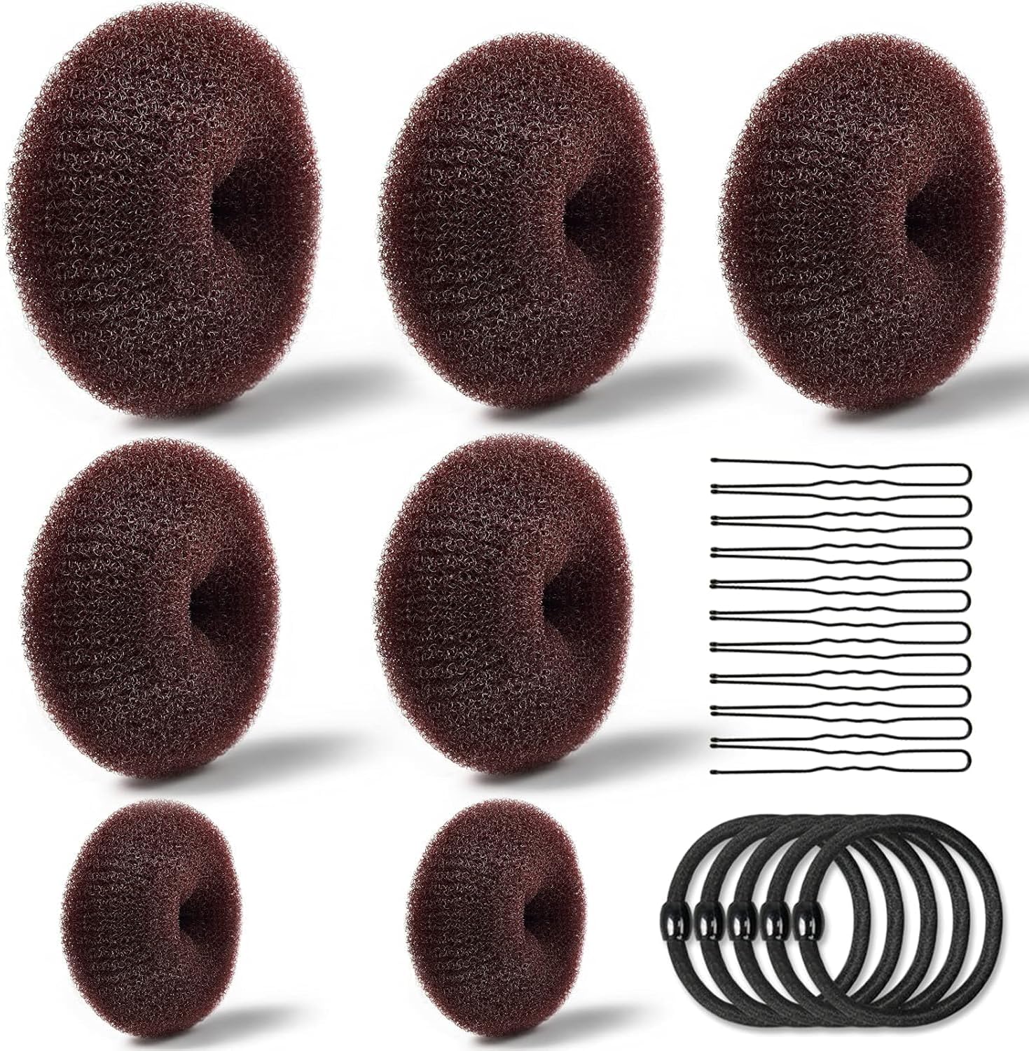 Package: 4 different sizes brown donut bags, 6 elastic hair bands and 20 Bobby pins.
