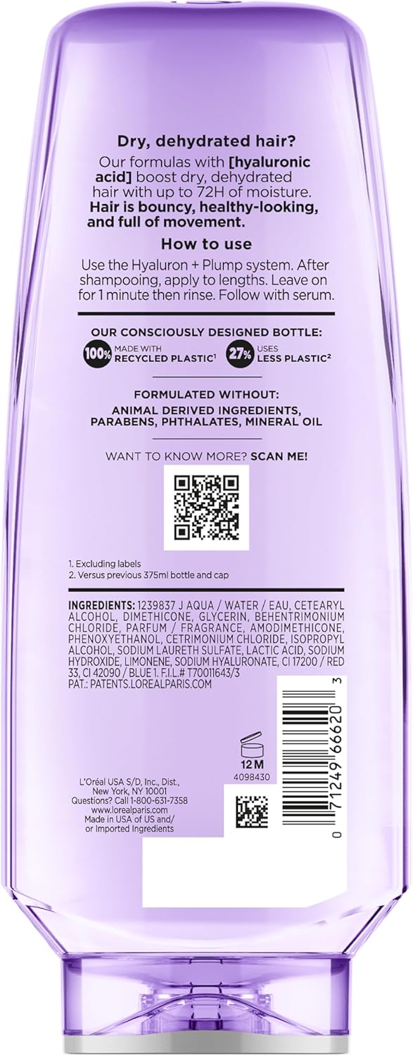 L’OREAL PARIS Elvive Hyaluron Plump Hydrating Conditioner for Dehydrated, Dry Hair Infused with Hyaluronic Acid Care Complex, Paraben-Free, 12.6 Fl Oz