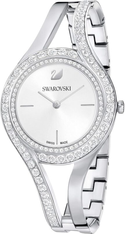 Rows of crystals are the focus of this two-tone watch; you won’t be able to take your eyes off it. A silver sunray dial with gold-tone indexes is the perfect contract to the pavé topring.