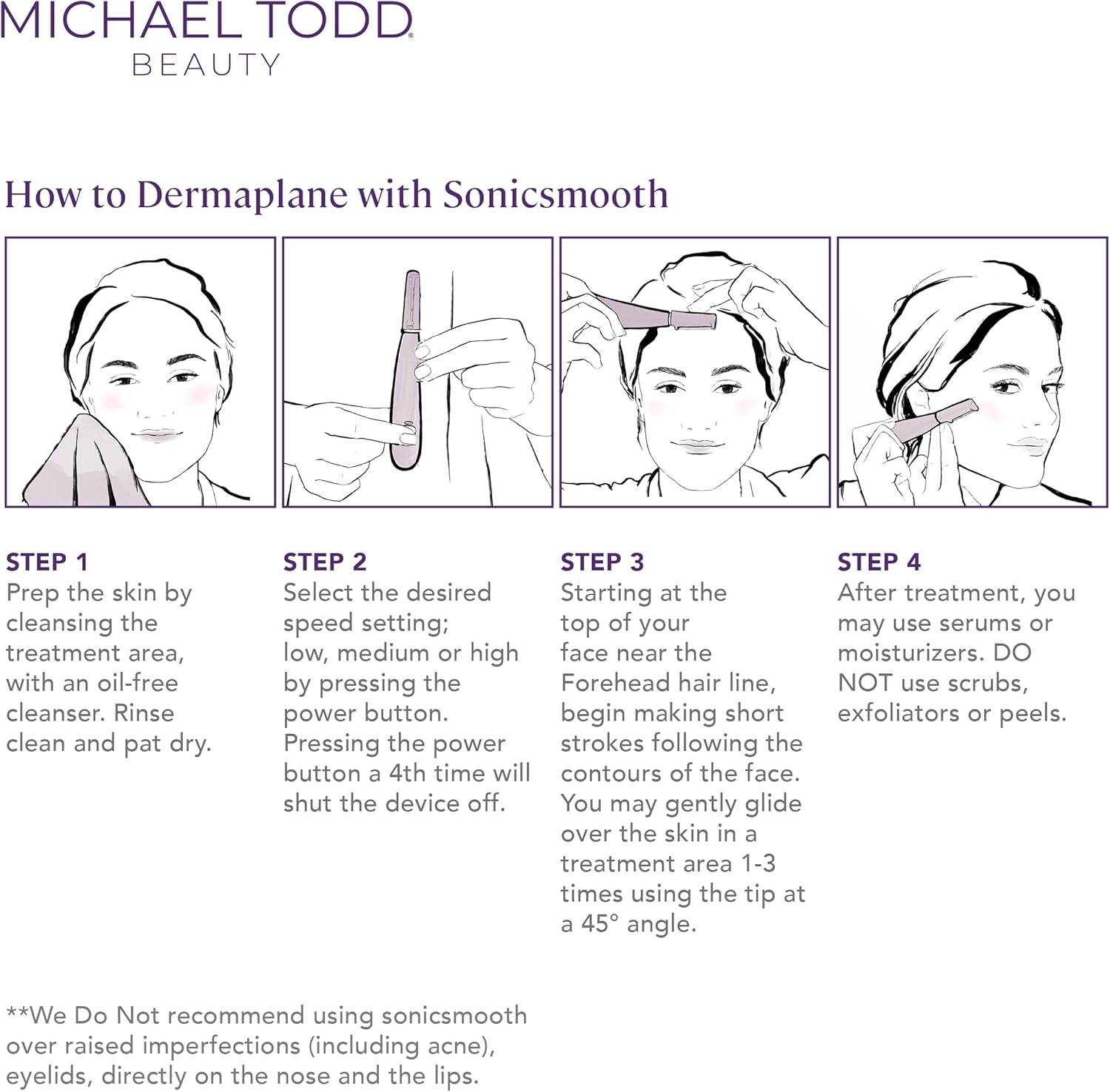 Unlock the secret to a renewed and luminous appearance with Sonicsmooth – your ultimate beauty companion for achieving visibly rejuvenated skin and a seamless makeup finish. This innovative dermaplaning tool not only exfoliates away dead skin and removes unwanted facial hair, but it also works wonders in reducing fine lines and wrinkles, revealing a youthful radiance like never before. Experience the instant transformation to youthful, smoother, softer, and radiant skin with Michael Todd Beauty’s award-winning, at-home sonic dermaplaning system. Now with 3 times more sonic power, Sonicsmooth delivers unparalleled results. Dermatologist-approved, it offers quick, easy, and painless exfoliation and effective peach fuzz removal. Sonicsmooth revolutionizes skincare with 3 adjustable speeds for personalized dermaplaning, ensuring optimal comfort. Its portable design enables on-the-go care, TSA-safe for travel. The rechargeable battery provides 3 hours of cord-free use after a 12-hour charge, offering uninterrupted skincare convenience. The 8-week supply of stainless steel safety edges enhances safety and efficacy, empowering flexible and worry-free skincare anytime, anywhere. Travel-friendly and safe for carry-on luggage, the dermaplaning system grants you the freedom to move and prioritize your skincare wherever you go with its built-in rechargeable battery. Enjoy up to 3 hours of cord-free operation after an initial 12-hour charge. Say farewell to being tied to a wall and embrace the convenience of uninterrupted skincare. Features a USB rechargeable battery. Achieve smooth, flawless skin by following these simple steps. After cleansing and drying your face, gently glide Sonicsmooth over the desired treatment area using short, gliding motions. This will effectively remove unwanted facial hair and exfoliate dead skin cells. For best results, it is recommended to avoid applying makeup directly after using this device. Our dermaplanners come with a risk-free guarantee. If you’re not delighted with the results within 30 days, we offer a hassle-free money-back guarantee. Your satisfaction is our priority—we stand behind our product to ensure you experience the best in skincare.