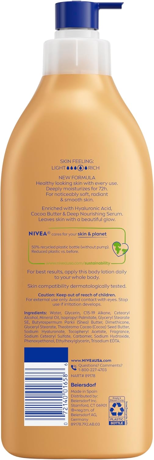 Carefully Selected Ingredients: This NIVEA body lotion is infused with Deep Nourishing Serum, cocoa butter and Vitamin E for a healthy looking glow