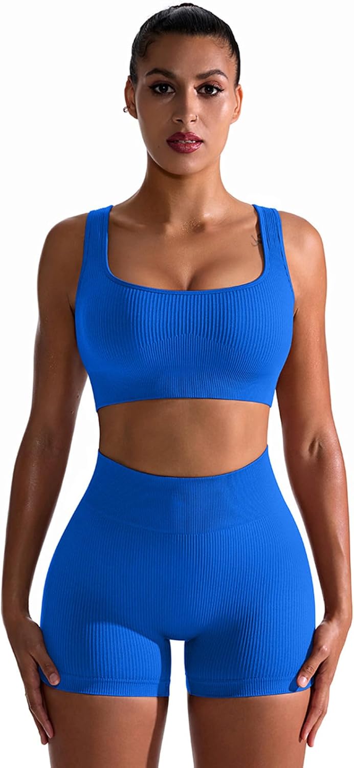 Our stylish and comfortable 4 piece workout set for women! Made with lightweight and moisture-wicking power fabric, this ribbed set is perfect for yoga, gym, and any other active activity. The high elasticity and breathable material provide ultimate comfort and flexibility, while the tummy control wide waistband contours your curves and shapes your body. The ribbed textured non-slip design ensures you stay in place during your workout, and the padded bra and leggings are thick enough to be non-see through and very supportive. The triangular design of the crotch provides ample coverage as you move from pose to pose and prevents thighs from rubbing. Various colors available black,pink,blue,red,brown,green,white,purple,light pink,hot pink,beige, burgundy,royal blue.