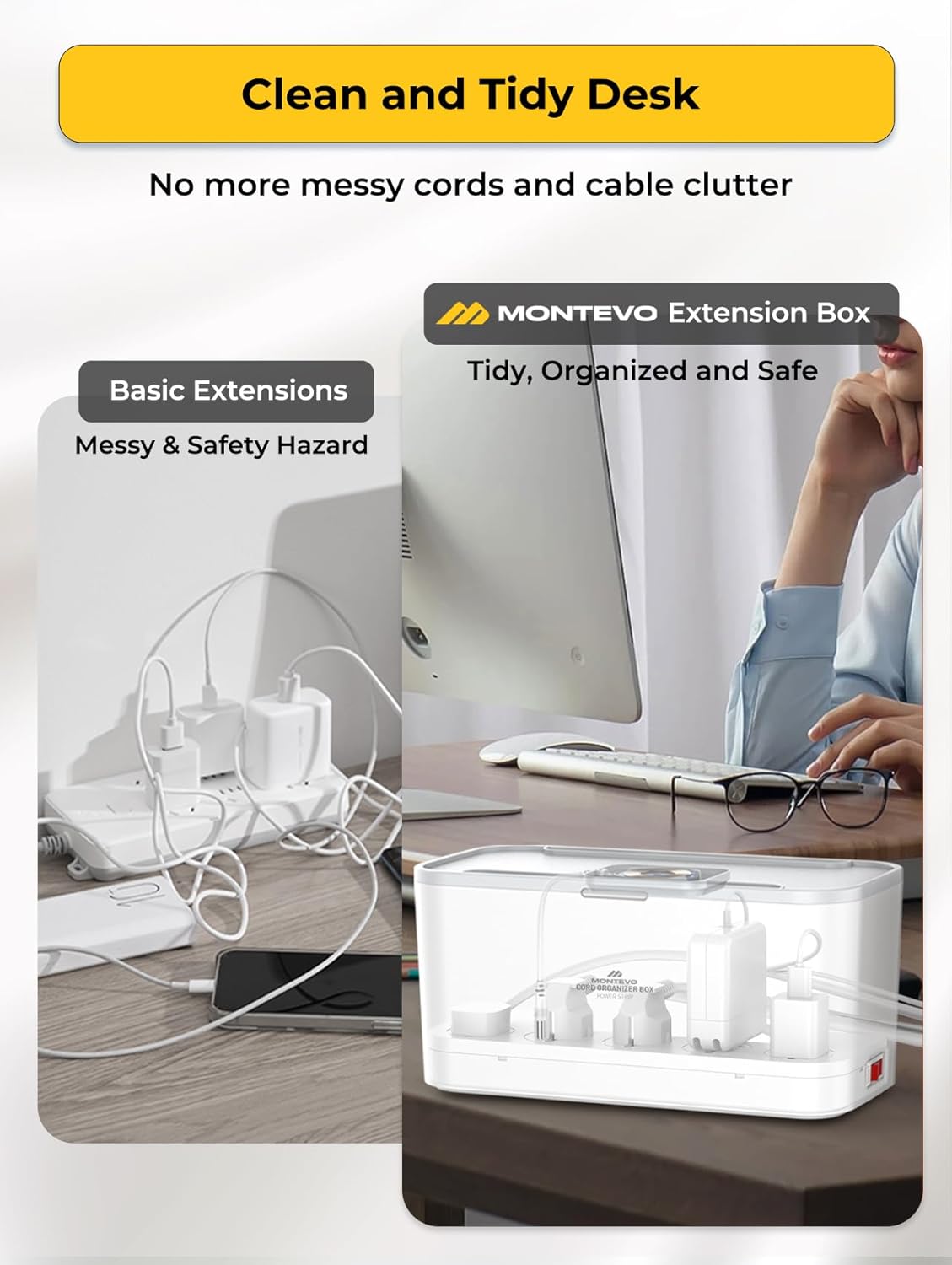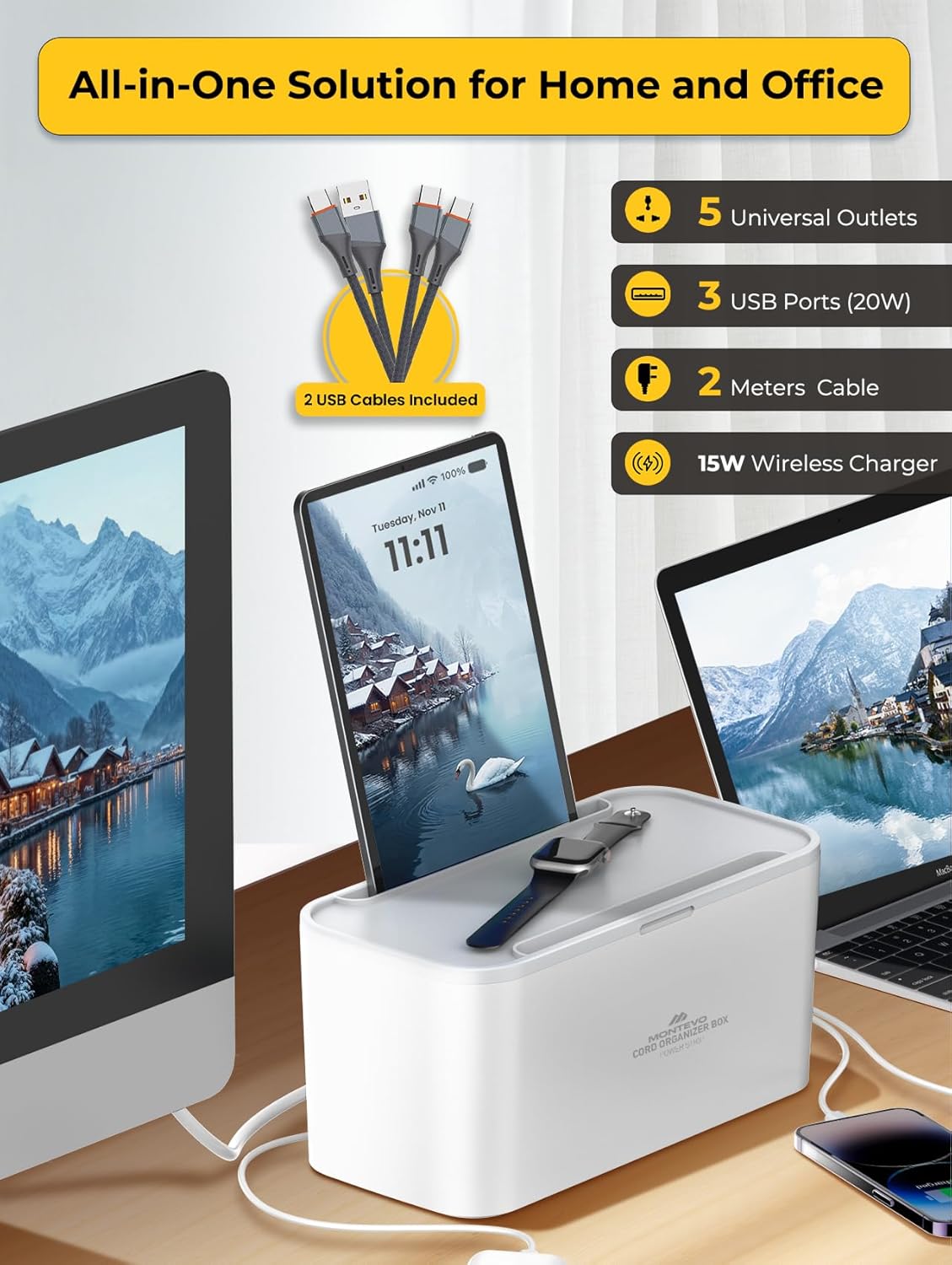 【5-in-1 Power Extension Organizer Box】 MONTEVO cable management box combines a power extension cord with 5 universal outlets, 1 USB-C port, 2 USB-A ports, a 15W wireless charger, and two built-in trays for tablets or smartphones, keeping desks and workspaces clean and organized.