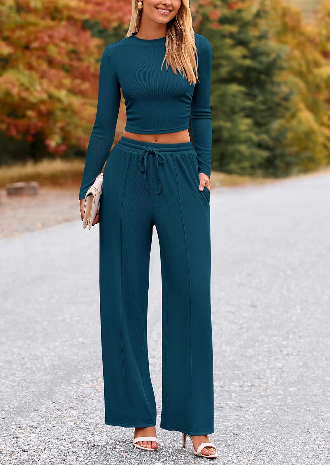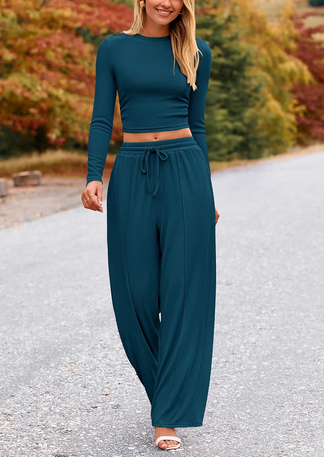 Two Piece Outfits/ Loungewear Set/ Wide Leg Pants Set/ Fall Sets/ Womens Long Sleeve Tee Shirt/ Fitted Crop Tops/ Ribbed Knit Tops/ Palazzo Pants/ Long Pants with Pockets/ Drawstring Sweatpants/ Ruched Tops
