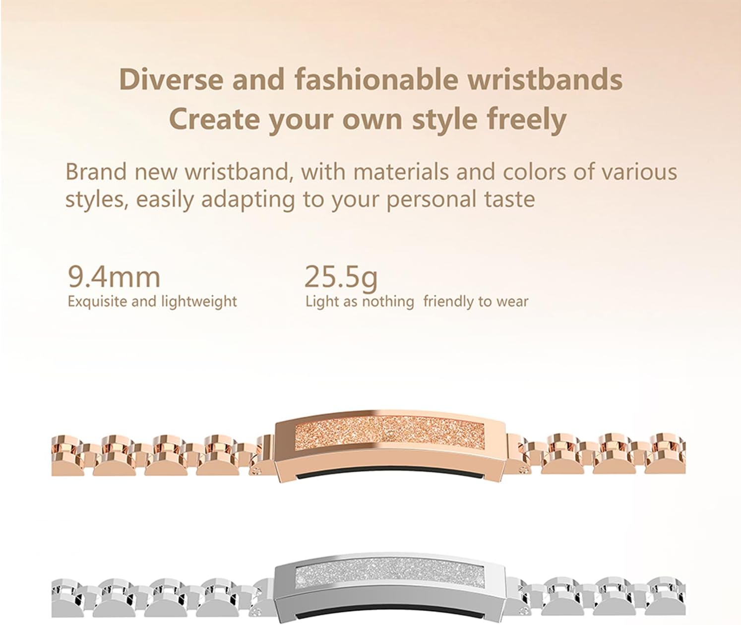 DESIGN: Elegant smart bracelet available in silver and rose gold finishes with a sleek crystalline display panel for modern sophistication
