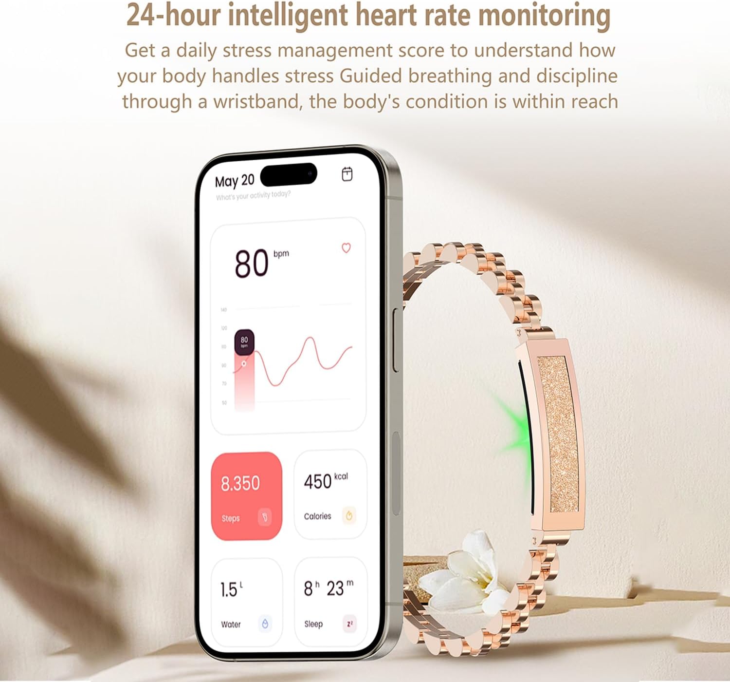Elevate your digital lifestyle with this sophisticated smart bracelet that seamlessly blends fashion with technology. Available in sleek silver and luxurious rose gold finishes, this elegant wearable features a stunning crystalline display panel that adds a touch of sparkle to your wrist. The premium metal link band offers both durability and style, with a secure clasp mechanism ensuring a comfortable fit throughout your day. The bracelet’s slim profile and modern design make it suitable for both casual and formal occasions. The metallic finish complements any outfit while housing advanced smart features beneath its fashionable exterior. The thoughtfully engineered band links allow for easy size adjustments to achieve the perfect fit. This smart bracelet stands as a testament to the perfect marriage of contemporary technology and timeless jewelry design, making it an ideal accessory for the modern, connected individual who refuses to compromise on style.