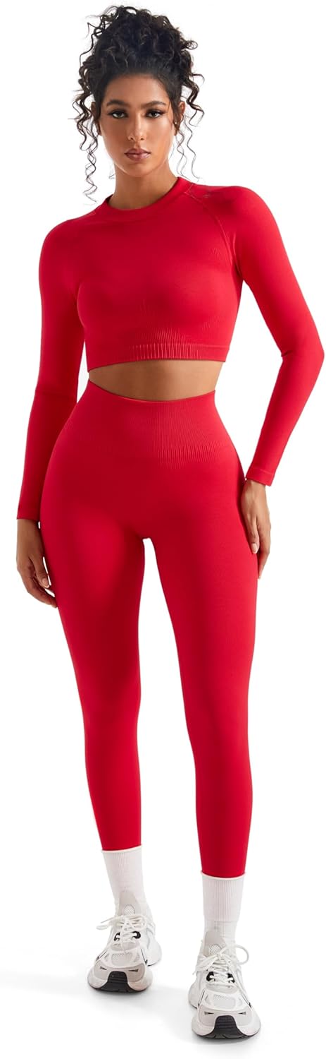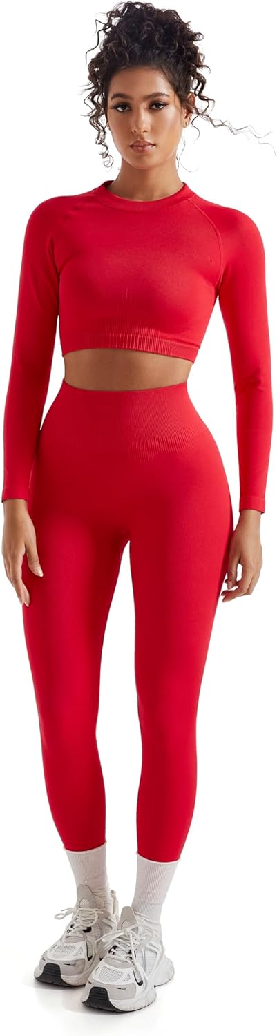SUUKSESS Women 2 Piece Workout Sets Hidden Scrunch Hip Lifting Seamless Leggings Long Sleeve Yoga Crop Tops