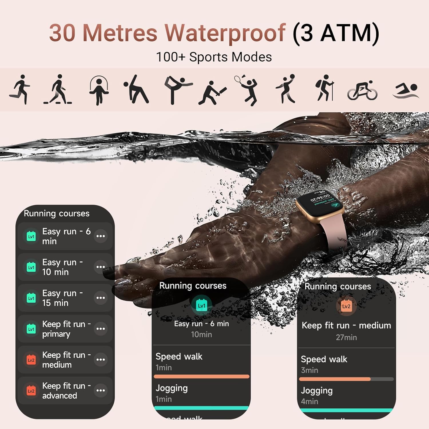 【100+ Sports Modes and 3ATM Waterproof】The fitness watch supports 100+ sports modes (running, cycling, swimming, yoga, basketball, walking, etc.), and monitors data in real time during exercise, such as steps, distance, calorie consumption, heart rate and blood oxygen exercise time to help adjust the training intensity to achieve better exercise results. The built-in pedometer can track daily steps and calorie consumption. At the same time, it is equipped with a sports watch 3ATM waterproof design, which can be used safely on rainy days, daily hand washing, and swimming.