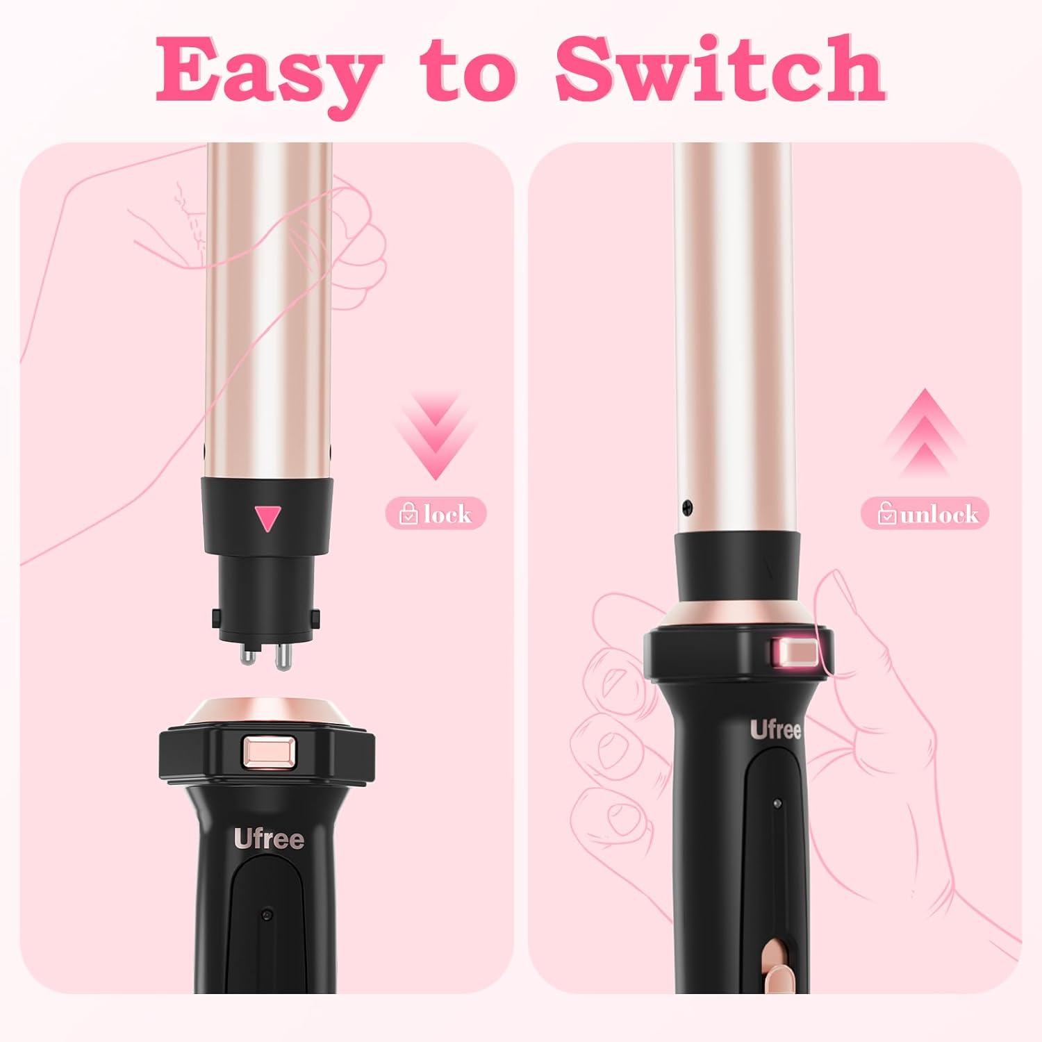 Ufree 5-in-1 Curling Iron Set in sleek black with charming pink accents. This innovative curling wand boasts a cutting-edge design for creating a myriad of stunning looks. The 5 varied barrels, including 1 inch tapered and straight options, cater to your every styling whim, letting you effortlessly switch between different sizes with precision and ease. Crafted with a ceramic barrel and PPS barrel adapter material, this curling wand ensures optimal heat distribution for glamorous, long-lasting curls. The 360-degree automatic rotation feature, along with the heat-safe stand, anti-scald grip, and power indicator, guarantees a safe and convenient styling experience every time. With its instant heat-up capability, the hair curler for long hair short hair allows you to achieve your desired look in no time. Whether you prefer tight coils or loose waves, this hair curler offers versatility for all hair types. Say goodbye to uninspired hairstyles and step into a world of limitless styling possibilities with the Ufree 5-in-1 Curling Wand Set.