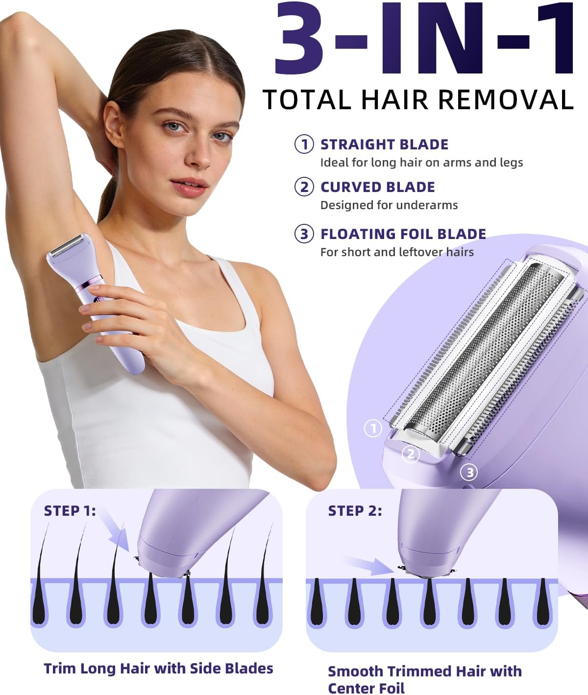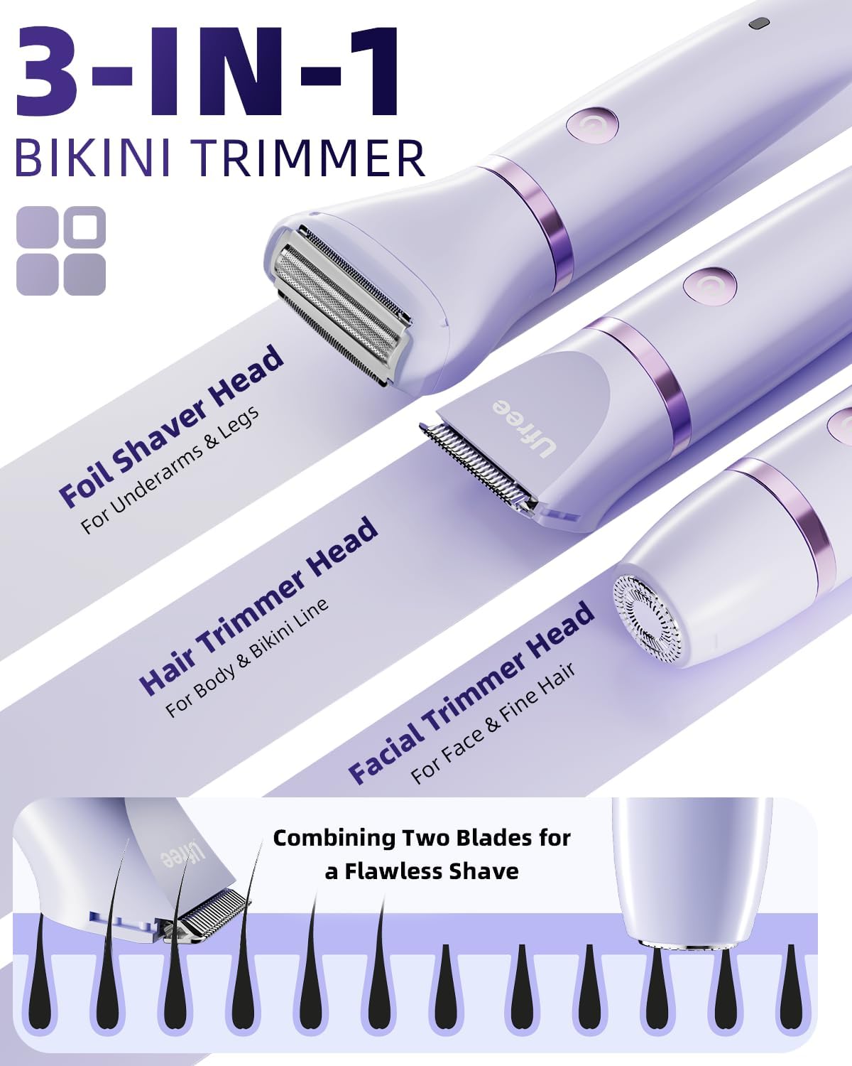 Ufree Women’s Bikini Trimmer, Electric Razor for Pubic, Leg, Face & Body Hair, Wireless, Waterproof, 3 Interchangeable Heads, Purple