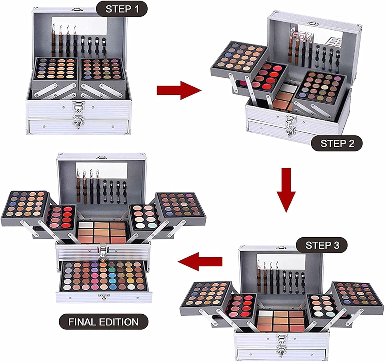【Ingenious box design】The makeup box is made of solid material, multi-layer design,durable expansion box,can be stretched and folded well.Each layer has different cosmetics,such as eye shadow, blush, lipstick,contour modifier,concealer,makeup tools,Simple and convenient to use.